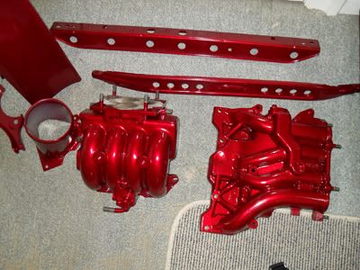 A few weeks ago I sent some peices of the rx7 over to tauranga to get powdercoated, now they're back and looking great! The colour chosen was similar to a candy apple red finish, it should look great in the engine bay. Coated parts - Rear wing, top & bottom intakes, throttle body/filter adapter tube, strut brace and radiator brace.